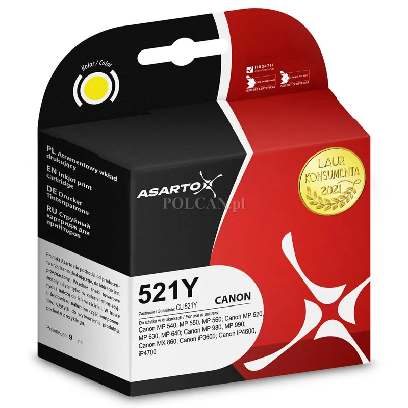 Tusz Asarto do Canon 521Y | 2936B001 | 810 str. | yellow. Pasuje do urządzeń: Canon PIXMA 4600, Canon PIXMA 4700, Canon PIXMA 550, Canon PIXMA 560, Canon PIXMA 620, Canon PIXMA 630, Canon PIXMA 640, Canon PIXMA 980, Canon PIXMA 990, Canon PIXMA iP3600, Canon PIXMA MP540, Canon PIXMA MX860
