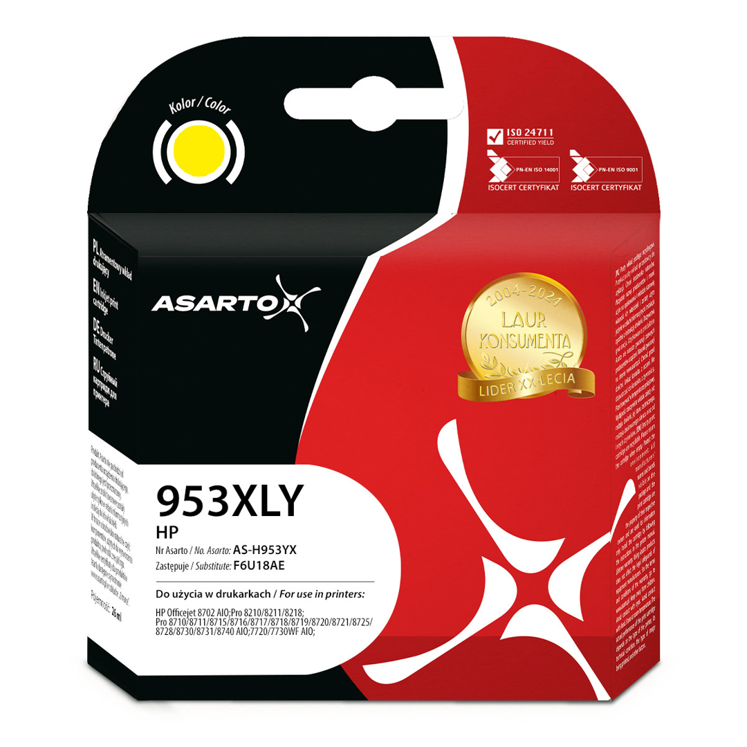 Tusz Asarto do HP 953XLY | F6U18AE | 1600 str. | yellow | REF.. Pasuje do urządzeń: HP OfficeJet Pro 7740, HP OfficeJet Pro 8210, HP OfficeJet Pro 8218, HP OfficeJet Pro 8715, HP OfficeJet Pro 8720, HP OfficeJet Pro 8725, HP OfficeJet Pro 8730, HP OfficeJet Pro 8740